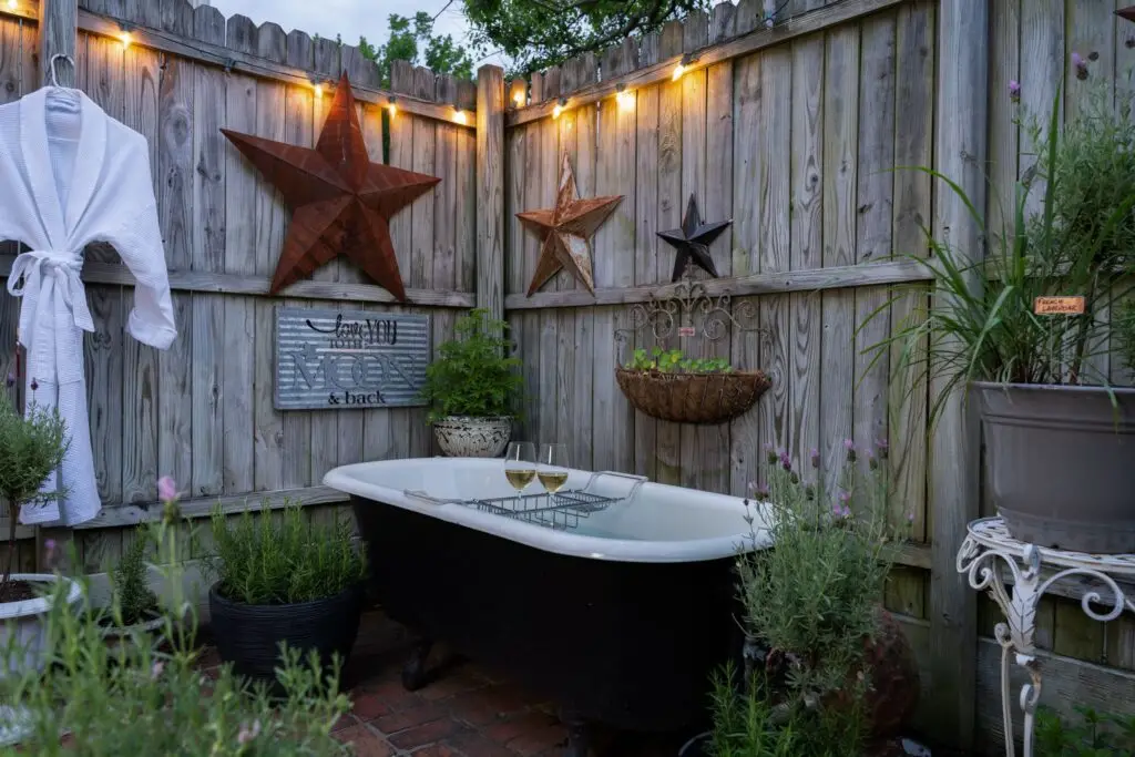 “Musing upon the words “we’re on this earth about a minute and a half, and I want joy. I want to feel good about our collective lot in life. Such thoughts are hard to resist as my wife and I soak in warm suds in a claw-foot outdoor bathtub, which is part of Hope and Glory’s open-air shower, cloistered by an eight foot fence and a huddle of old maples. We stare at a sweet crescent moon and listen to Ella Fitzgerald tunes that drift from the main house. The hideaway is about the size of a couple of tool sheds, with retro sinks, antique mirrors and a 1950’s era shower that sports a head the size of a hubcap. Divine accents include candles, strings of white lights draped across the fences and the whiff of honeysuckle. Bathing under the stars is primal, a reminder to our bodies that they are, in fact, cousins of the chickweeds that climb from underneath the tub (okay, distant cousins). Just when I’m about to quote Whitman, I notice two yellow rubber ducks standing guard on a shelf to our left. Unblinking with painted grins, they’re begging to dive into our party. Only those without Hope and Glory could say no.” – Michael McCarthy, Travel Writer
