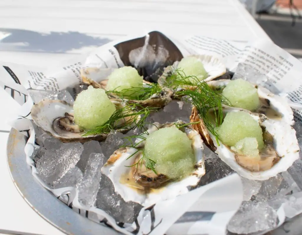 A raw oyster gently placed atop a flute of champagne – champagne being the ultimate wine choice to pair with oysters – salty and briny oysters bring out the umami(a basic taste which is pleasant and savory) flavor in champagne.